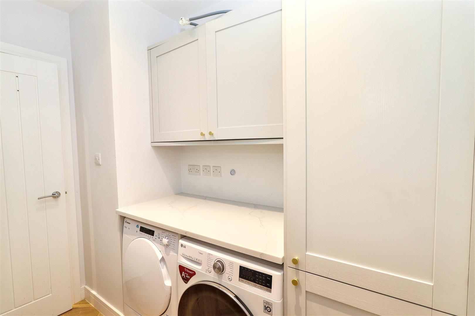 The high-spec kitchen includes a Quooker boiling water tap, NEFF double ovens (one with integrated microwave) with plate warmer, five-ring NEFF induction hob, full-size dishwasher and plumbed American-style fridge freezer. A separate utility room offers space for washer and dryer, alongside excellent storage throughout.