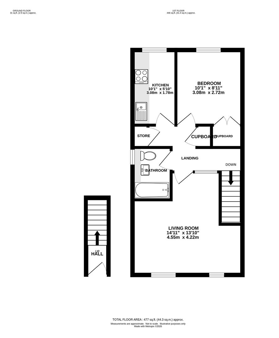 The property benefits from its own private entrance, leading to a hallway with stairs rising to the first-floor accommodation. A central landing provides access to a spacious living room with front-facing views. The bright kitchen is fitted with a range of eye and base level units, while the bathroom features a modern white suite with a shower fitted over the bath. The double bedroom is well proportioned and benefits from built-in wardrobes.