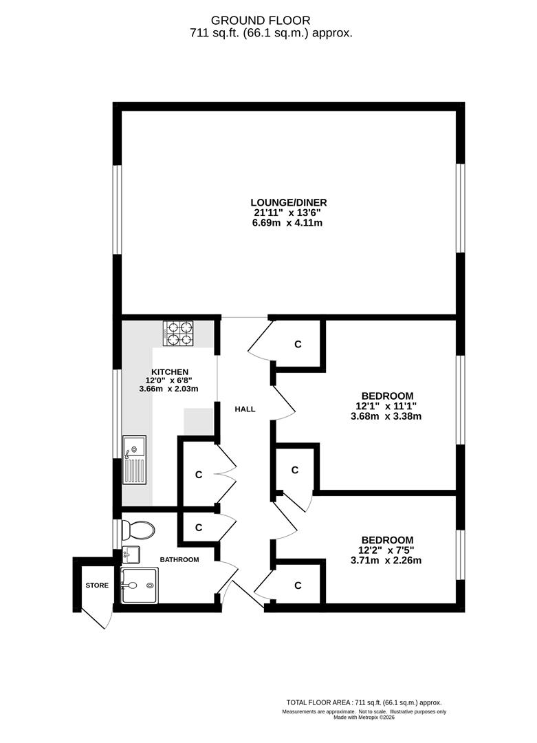 The internal layout commences with a spacious entrance hall featuring ample storage cupboards. The kitchen is well-appointed with a range of eye and base level units, along with space for freestanding appliances. The generous dual-aspect lounge/diner offers a bright and comfortable living space, perfect for both relaxing and entertaining. There are two well-proportioned bedrooms, complemented by a modern shower room.