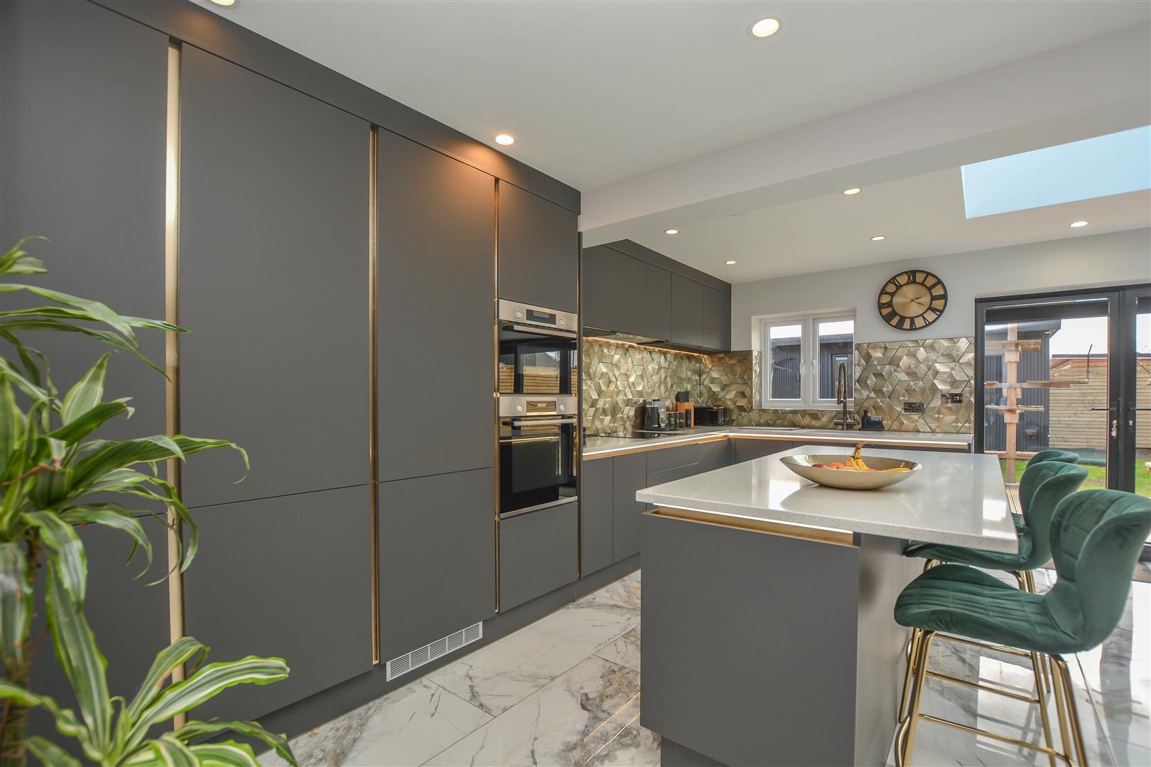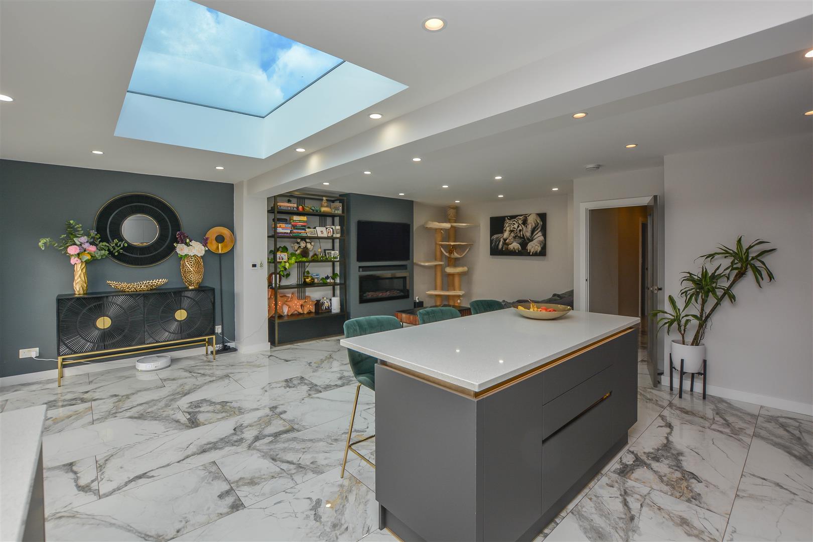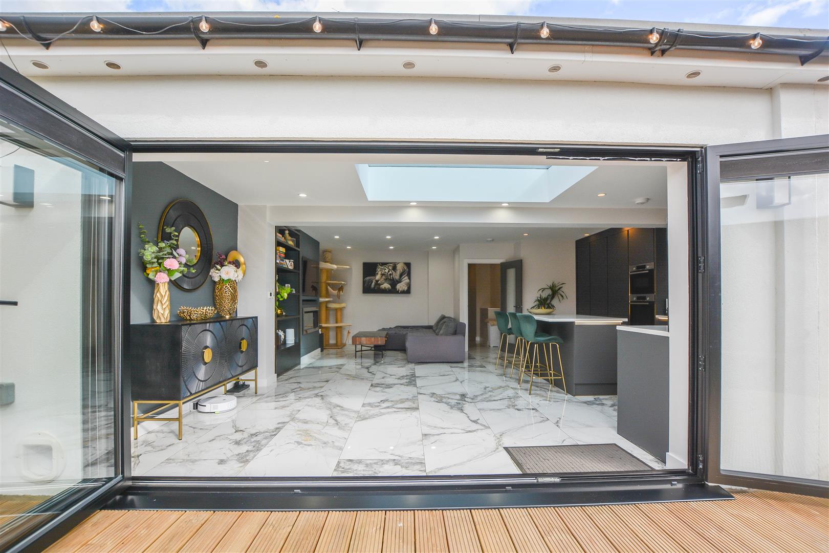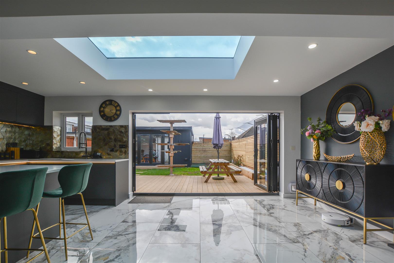 The internal accommodation begins with a useful entrance porch leading into a welcoming hallway, which provides access to all rooms. The property benefits from underfloor heating throughout, adding a touch of comfort and efficiency. To the rear, an impressive open-plan kitchen and lounge create an ideal space for both everyday living and entertaining, enhanced by a large skylight and bi-fold doors that open seamlessly onto the garden. The stylish kitchen is fitted with sleek cabinetry, granite work surfaces, a range of integrated appliances, and a convenient boiling water tap.