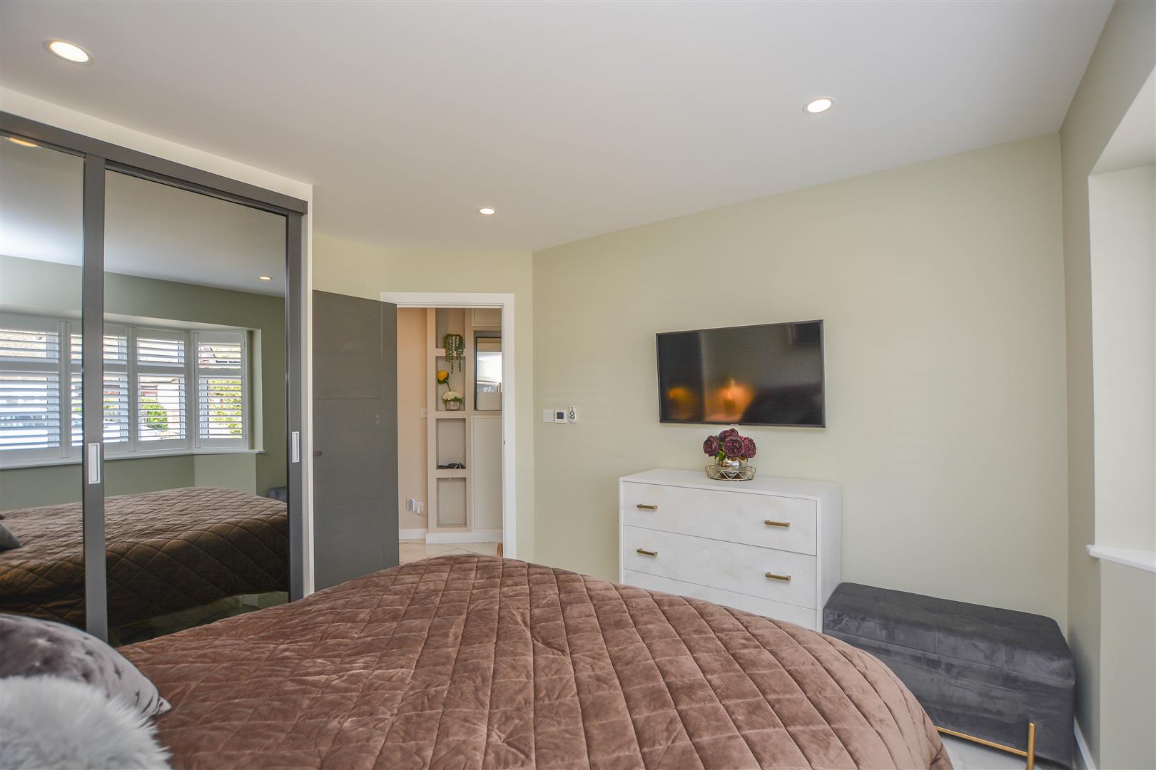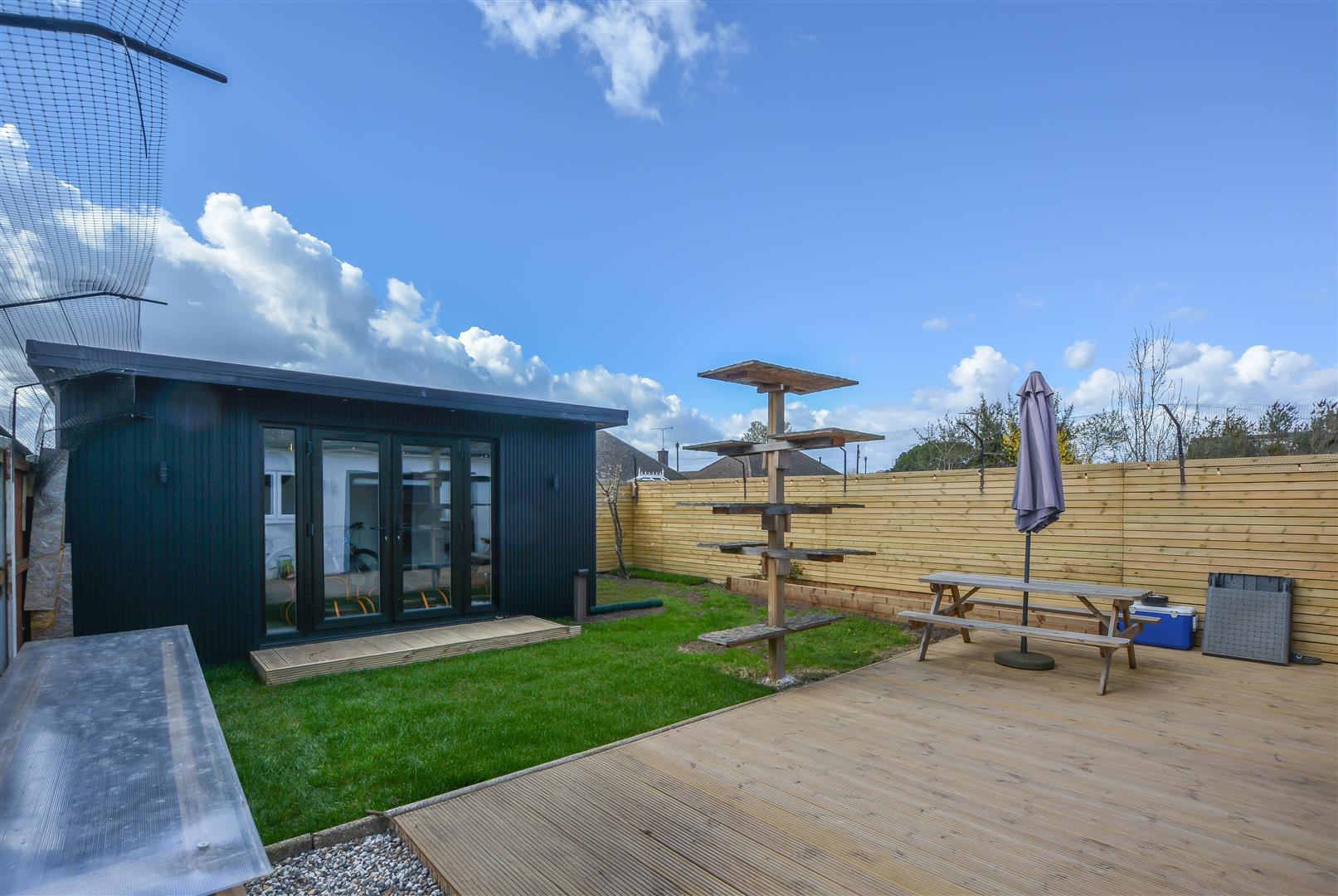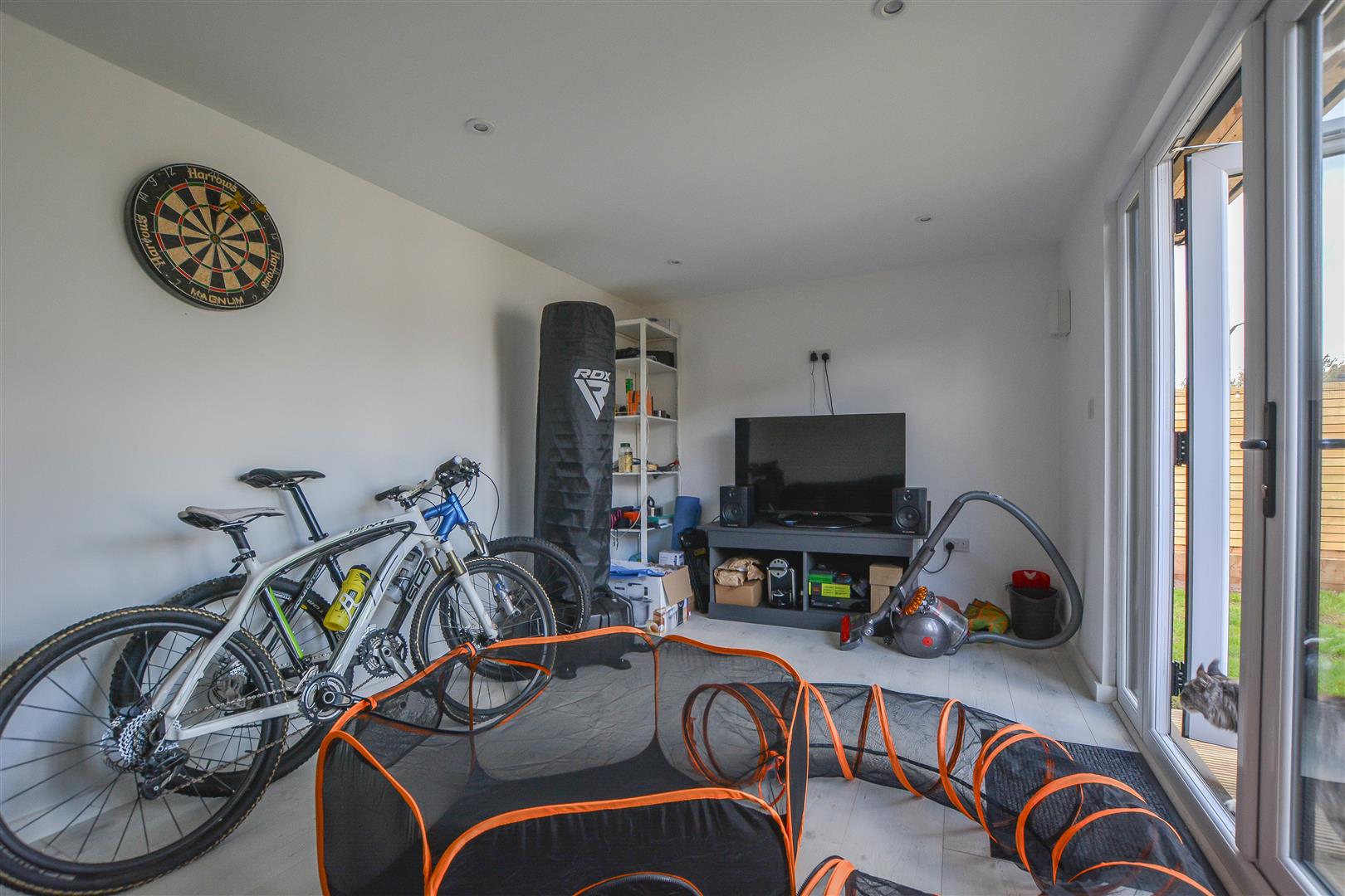 Externally, the rear garden features an attractive decked seating area, leading onto a neatly maintained lawn. A spacious, purpose-built outbuilding with French doors offers a versatile space, perfect for use as a home office, gym, or studio. To the front, a block-paved driveway provides off-street parking.