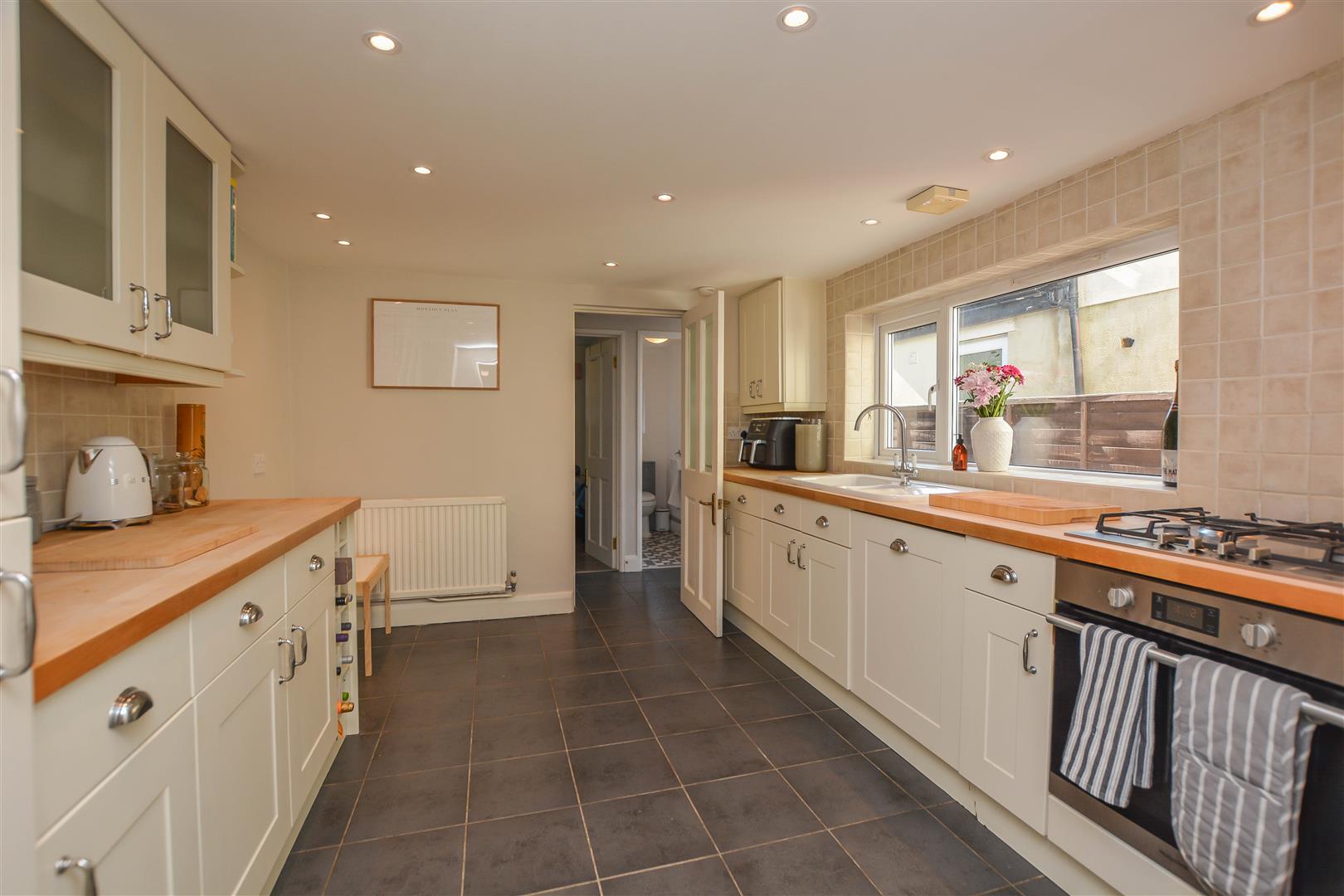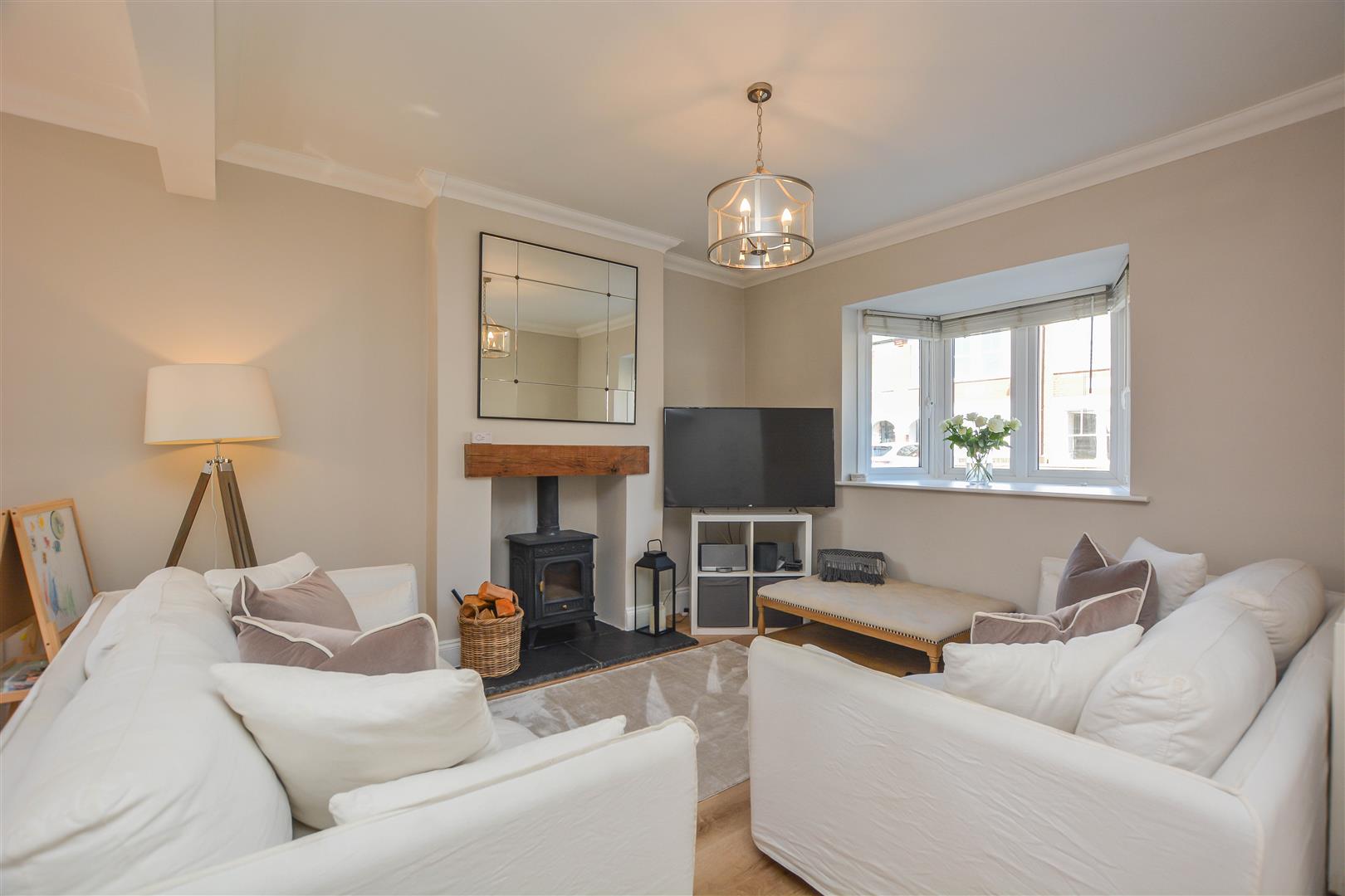 The accommodation begins with an entrance hallway leading through to the main reception area. This bright, open-plan space features a bow window to the front and a glazed door to the rear, providing direct access to the garden. The lounge is centred around a fireplace with a wood-burning stove, creating a cosy focal point. The kitchen is well-appointed with a range of wall and base units, generous worktop space, and a window to the side. A lobby area beyond offers access to a utility room, ground floor cloakroom, and an additional door to the rear garden.