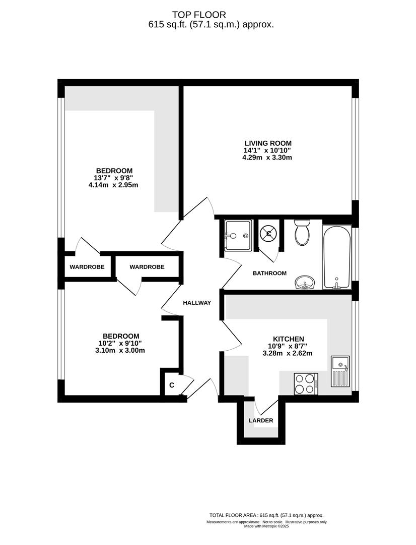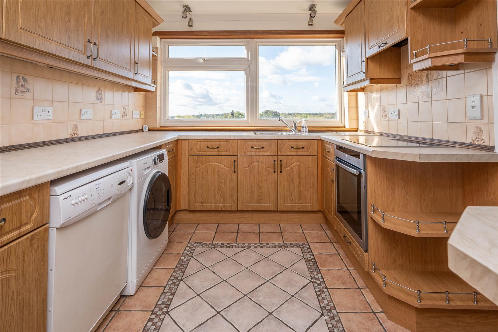 The internal accommodation has been newly painted and features generously sized rooms throughout, including a bright living room with a large window providing plenty of natural light and far-reaching views. The well-equipped kitchen offers ample eye and base level storage units, extensive worktop space, and enjoys similar elevated views. There are two double bedrooms, both with built-in wardrobes, along with a family bathroom featuring a four-piece suite. Externally, the property benefits from a garage en bloc, a communal rear garden, and residents' off-street parking to the front.