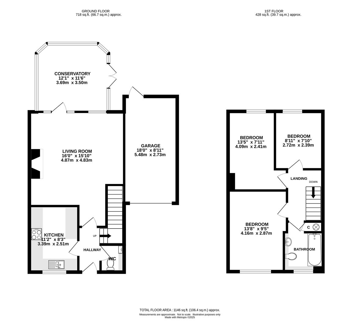 Leading from the lounge is the conservatory, a delightful addition flooded with natural light from its expansive windows and glass roof, offering attractive views across the garden. Double doors provide direct access to the rear garden. A ground-floor WC completes the accommodation on this level.