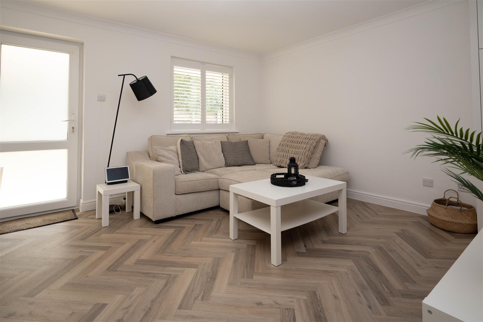 Step inside to a stylishly designed interior featuring a welcoming entrance hallway with elegant herringbone flooring flowing seamlessly throughout. The spacious lounge opens directly onto a patio area, ideal for relaxing outdoors. A well-appointed kitchen, sleek contemporary bathroom, and generously sized double bedroom with built-in storage complete the home's impressive layout.