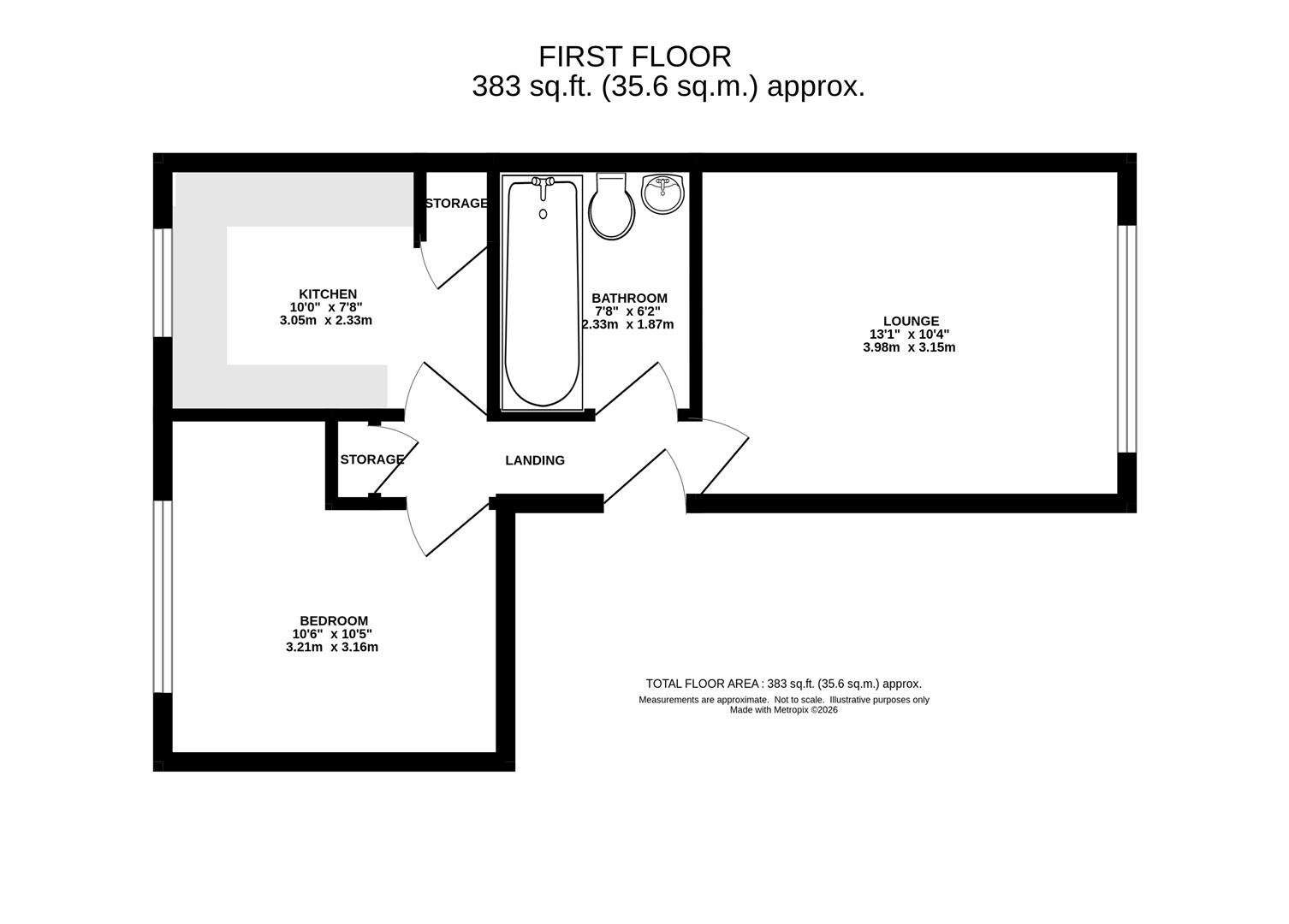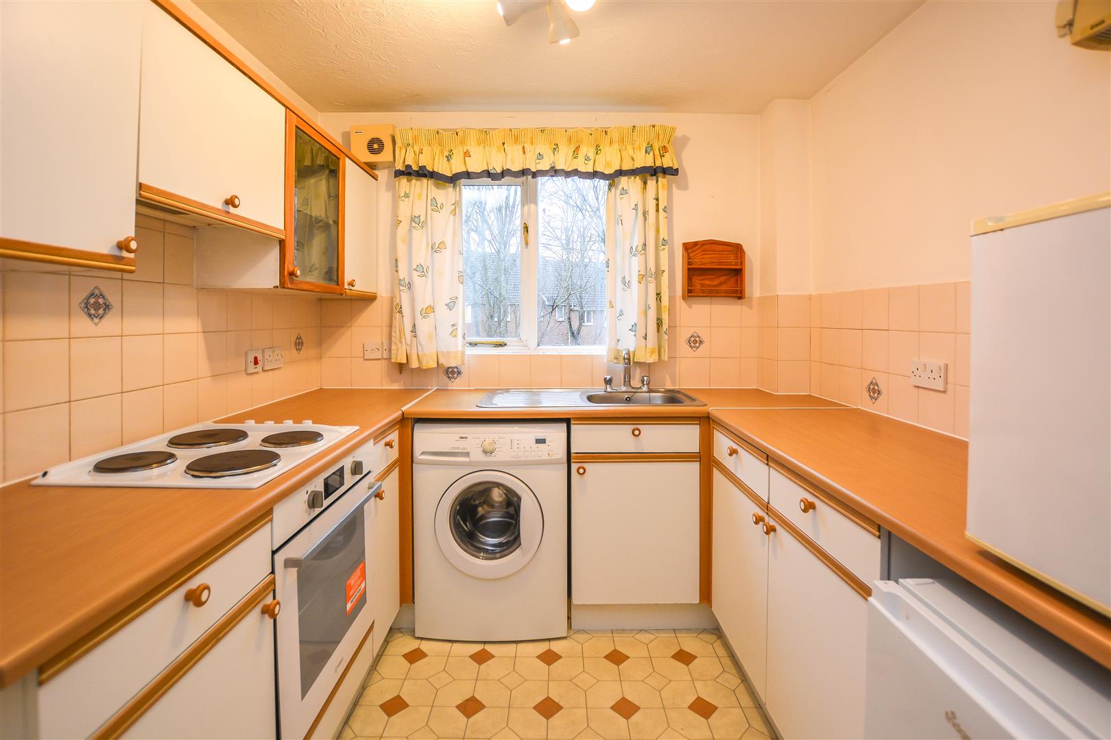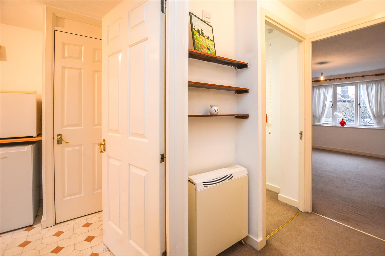 The apartment is accessed via a central landing, creating a practical and efficient flow to all rooms. The bright and spacious lounge is well proportioned, comfortably accommodating both living and dining furniture. Adjacent is a separate fitted kitchen, neatly arranged with a range of units and complemented by useful built-in storage cupboards, enhancing everyday practicality. The double bedroom is generously sized, and the bathroom is fitted with a white three-piece suite. Additional storage cupboards off the landing further improve functionality and convenience.