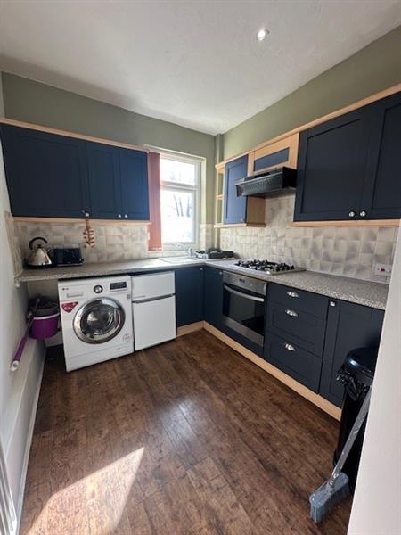 Modern fitted kitchen with a range of wall and base units, 1½ bowl sink with mixer tap, and integrated electric oven with four-ring gas hob and extractor. Plumbing for washing machine and space for a freestanding fridge freezer. Rear-facing uPVC double glazed window and tiled splashback.