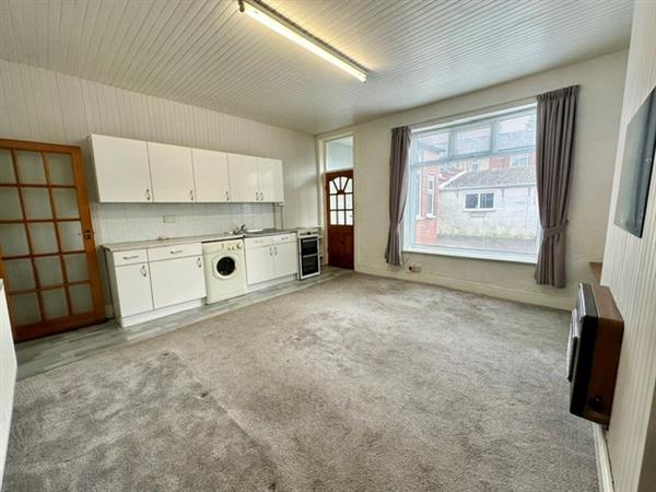Fitted with white wall and base units, work surfaces, stainless steel sink with drainer, freestanding cooker, plumbing for washing machine, radiator, large front racing window, dining space, and access to the rear porch and garden.