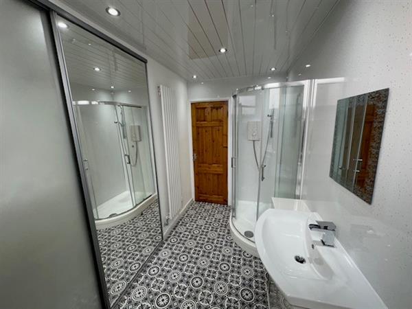 Three-piece suite comprising WC, wash hand basin and WC, with shower enclosure, Tiled splashbacks, ceiling spotlights and rear-facing frosted window.