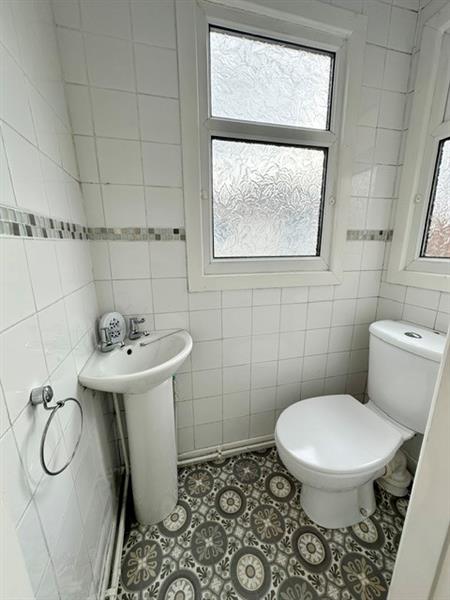 White two piece suite, tiled walls and flooring, rear facing window.
