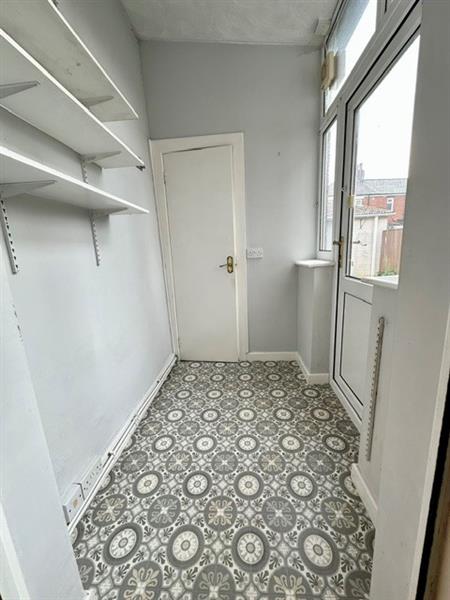 Storage space, tiled flooring and rear door providing access to yard and downstairs WC.
